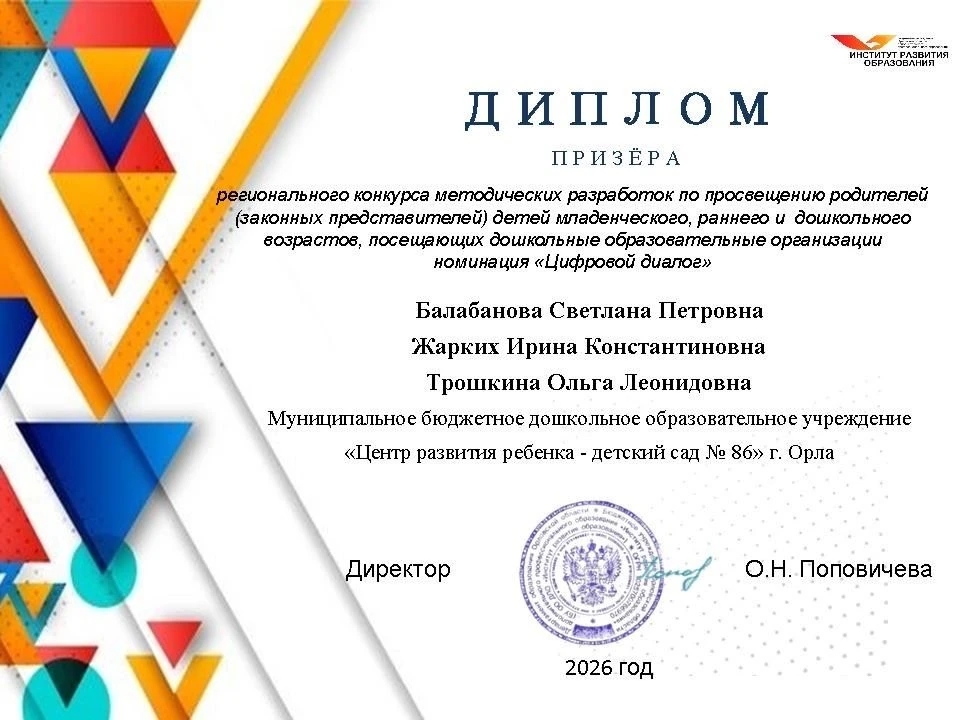 В конкурсе приняли участие 106 педагогических коллективов из 10 муниципальных образований Орловской области. В номинации «Цифровой диалог» наши педагоги Балабанова Светлана Петровна, методист учреждения и воспитатели детского сада Трошкина Ольга Леонидовна и Жарких Ирина Константиновна стали призерами Конкурса.
